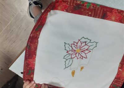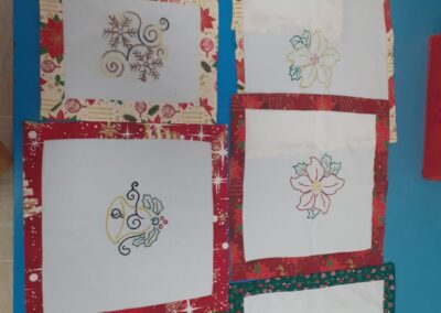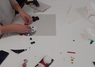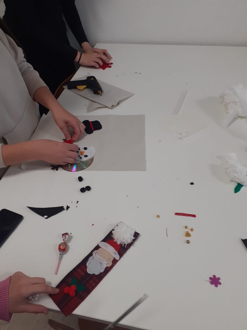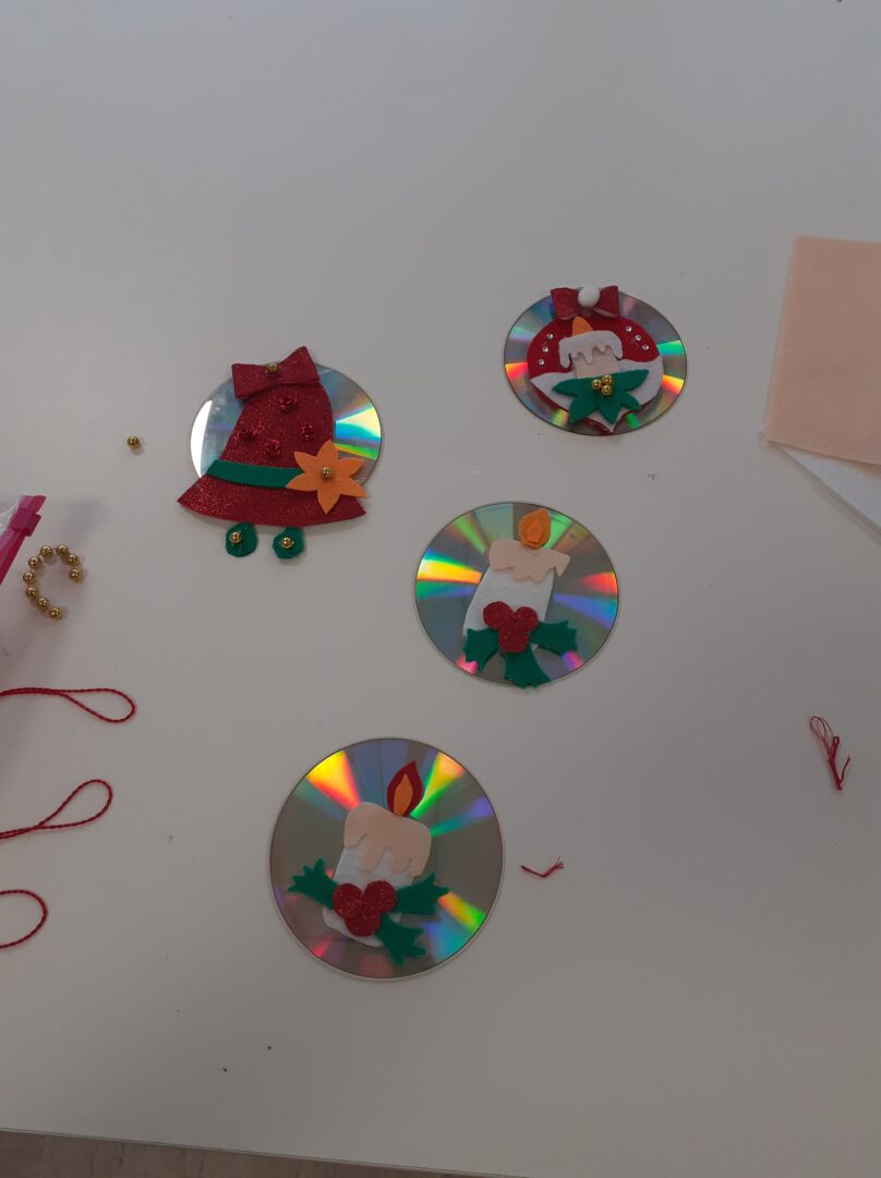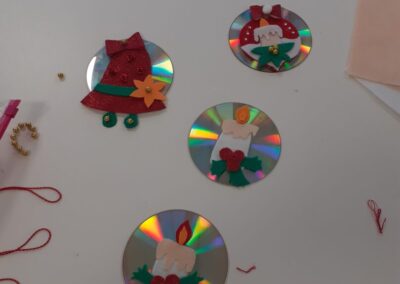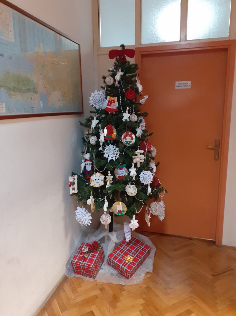 Koristeći odbačene CD-ove, izradili su ukrasne kuglice za bor na koje su zalijepili motive vezane za božićno vrijeme. Od papira su izrađene 3D pahuljice. Učenice prvog razreda izradile su nadstolnjake vezene ukrasnim koncem s božićnim motivima.